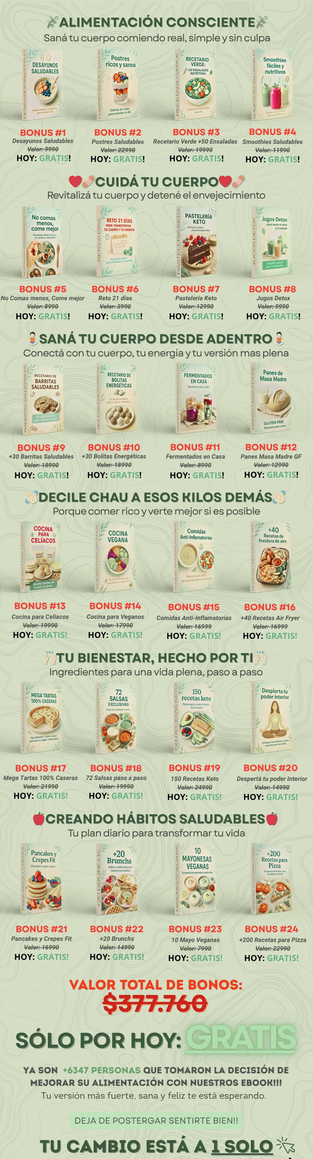 ¡Uff! Son un regalazo. Vas a encontrar recetas riquísimas, planes de comida, rutinas simples, recursos imprimibles, consejos para tu mente y más.